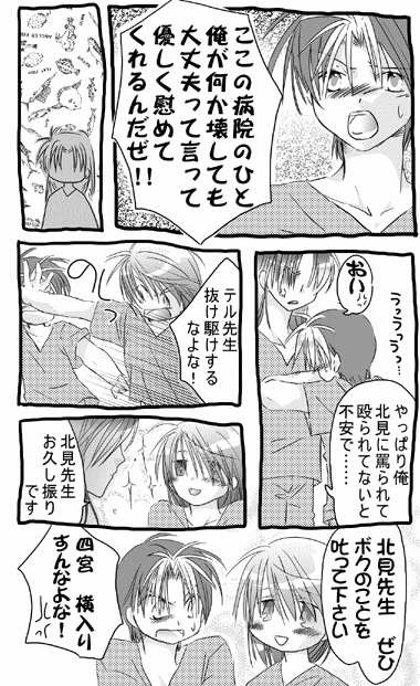 手術が終わった後で感動の再会を……ね? うっるせーなーこいつらー。 テルと四宮は北見をダシにして仲良く喧嘩してるのが定番。