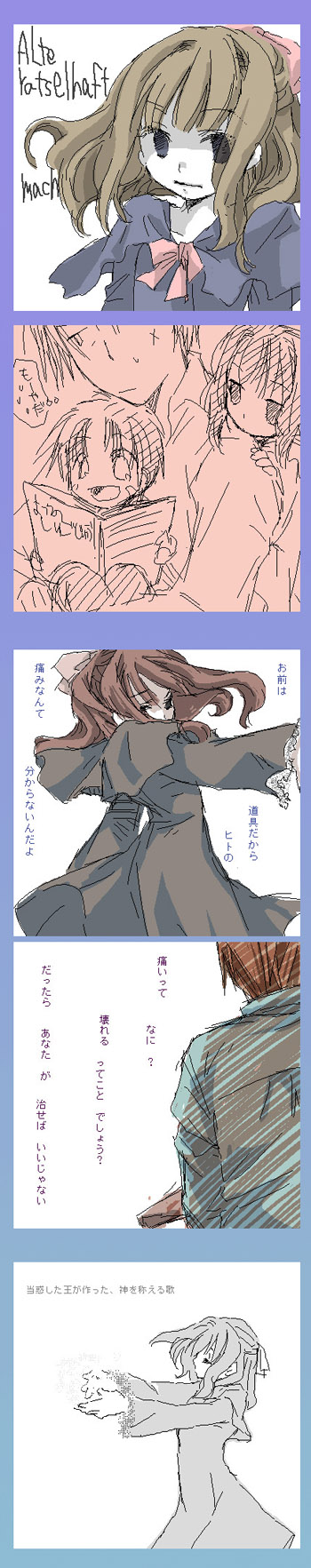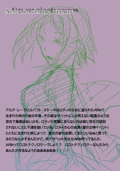 【Alte Ratselhaft Machine】(以下アルテ)は、ロディと同時期に造られた、彼と大元を一つとする彼専用の兵器。ロディが兵器として目覚めて自分を受け入れることを望んでいるので、彼の覚醒を促そうと色々とちょっかいをかけようとするも、それを良しと思わないゼペット先生に阻まれる。
